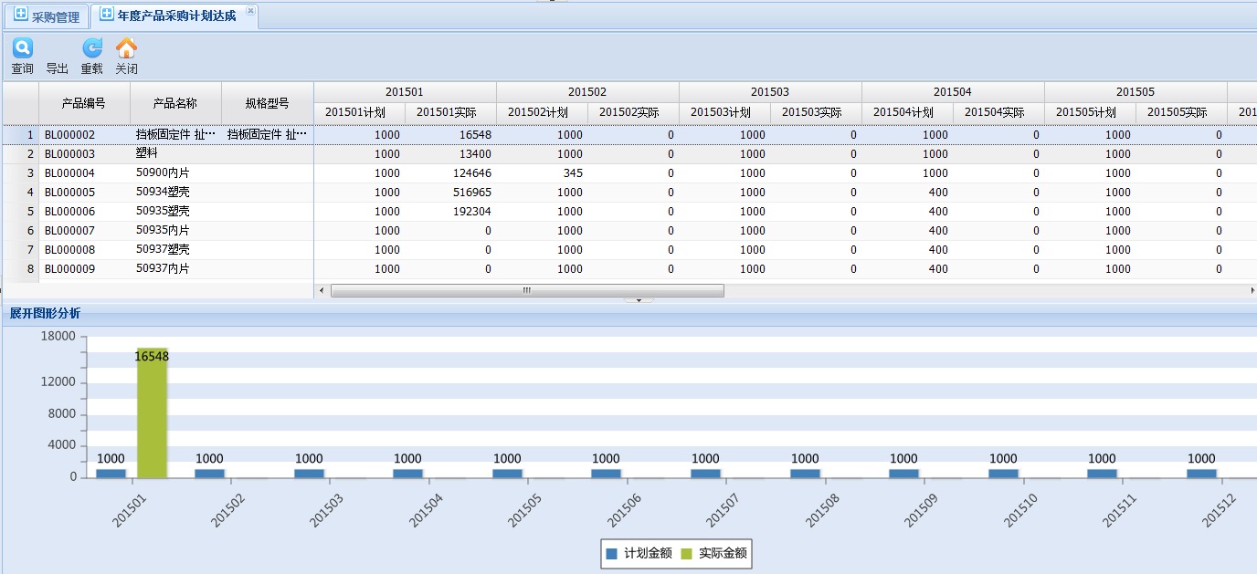 采購管理重點在于采購落實情況,下圖計劃達成可直接產(chǎn)看狀況,對于采購人員KPI有著客觀數(shù)據(jù),同時系統(tǒng)支持圖形化展示。