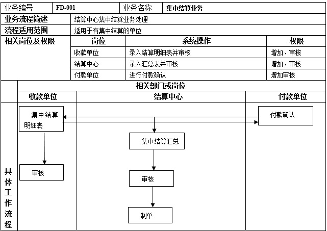 1、 收款單位填制集中結(jié)算明細表。 2、 付款單位進行付款確認,并把結(jié)果返回給收款單位。 3、 收款單位審核集中結(jié)算明細表。 4、 結(jié)算中心錄入集中結(jié)算匯總表,并對其進行審核。 5、 結(jié)算中心根據(jù)集中結(jié)算匯總表進行制單。 |