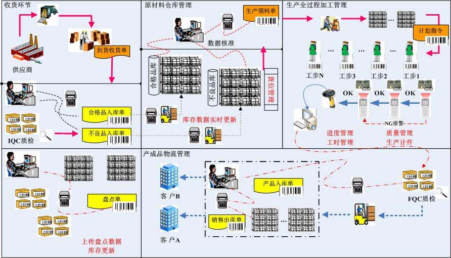 v 原料入庫環(huán)節(jié)——利用條碼技術(shù)和數(shù)據(jù)采集技術(shù),對良品與不良品進(jìn)行掃碼,系統(tǒng)適時更新庫存數(shù)據(jù)以及各個環(huán)節(jié)單據(jù)處理狀態(tài);