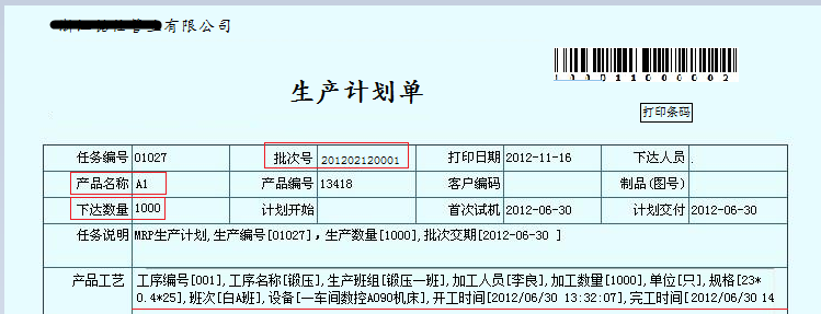 生產(chǎn)計劃中包含產(chǎn)成品的名稱、生產(chǎn)數(shù)量、開工日期、完工日期、產(chǎn)成品BOM領(lǐng)料單、生產(chǎn)批號,通過該生產(chǎn)計劃可以生成并打印產(chǎn)成品條碼編號;所以詳細(xì)信息記錄,全部自動傳遞至質(zhì)量追溯系統(tǒng);
