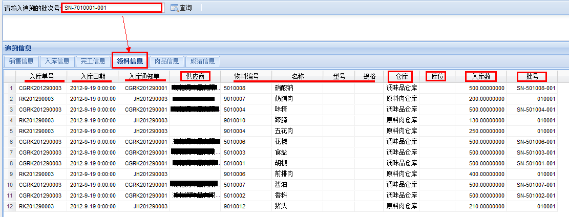 輸入追溯號,可追溯的產(chǎn)品領(lǐng)料信息包括物料供應(yīng)來源、物料名稱、物料型號、來源倉庫、來源庫位、領(lǐng)用數(shù)量、物料領(lǐng)用批號等信息;