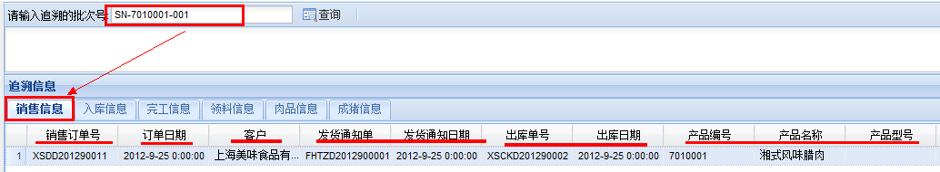 輸入追溯號,可追溯的銷售信息包括訂單編號、訂單日期、客戶名稱、銷售出庫單號、出庫日期、產(chǎn)品名稱、出庫批次等信息;