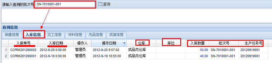 輸入追溯號,可追溯的成品入庫信息包括成品入庫單號、入庫日期、入庫倉庫、入庫批次號、入庫數(shù)量、生產(chǎn)任務(wù)號等信息;