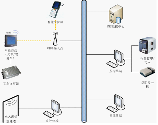 根據(jù)涵湛軟件WMS的RFID管理需求,目標(biāo)系統(tǒng)將由智能RFID手持機(jī)系統(tǒng)、智能RFID車載終端系統(tǒng)、智能RFID識(shí)別通道終端系統(tǒng)、中間件/接口系統(tǒng)三個(gè)子系統(tǒng),和WiFi/LAN 網(wǎng)絡(luò)共同構(gòu)成RFID倉儲(chǔ)終端管理系統(tǒng)。即智能RFID手持機(jī)系統(tǒng)、智能RFID車載終端系統(tǒng)、智能RFID識(shí)別通道終端系統(tǒng)、中間件/接口系統(tǒng),通過WiFi /LAN 網(wǎng)絡(luò)訪問并操作WMS系統(tǒng)數(shù)據(jù)庫,實(shí)現(xiàn)倉儲(chǔ)管理所需數(shù)據(jù)的互通與共享。網(wǎng)絡(luò)拓?fù)鋱D如下所示: