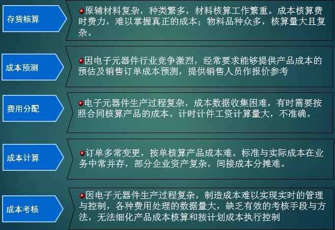 因電子元器件生產(chǎn)過(guò)程復(fù)雜,制造成本難以實(shí)現(xiàn)實(shí)時(shí)的管理與控制,各種費(fèi)用處理的數(shù)據(jù)量大,缺乏有效的考核手段與方法,無(wú)法細(xì)化產(chǎn)品成本核算和按計(jì)劃成本執(zhí)行控制