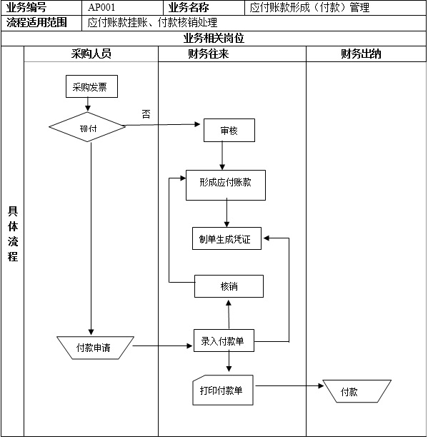 1、 采購(gòu)人員收到供應(yīng)商開具的采購(gòu)發(fā)票后錄入到【采購(gòu)管理】模塊,如果對(duì)供應(yīng)商本次開票付現(xiàn)款或付部分現(xiàn)款需要對(duì)采購(gòu)發(fā)票做現(xiàn)付處理。 2、 財(cái)務(wù)往來(lái)會(huì)計(jì)根據(jù)【采購(gòu)管理】模塊傳遞來(lái)的采購(gòu)發(fā)票,與手工收到的真實(shí)發(fā)票核對(duì),確認(rèn)無(wú)誤后,在【應(yīng)付賬款】內(nèi)對(duì)采購(gòu)發(fā)票進(jìn)行審核,生成相關(guān)憑證。 現(xiàn)付: 借:物資采購(gòu) 應(yīng)交稅金—應(yīng)交增值稅—進(jìn)項(xiàng) 貸:銀行存款(現(xiàn)金) 部分現(xiàn)付: 借:物資采購(gòu) 應(yīng)交稅金—應(yīng)交增值稅—進(jìn)項(xiàng) 貸:銀行存款(現(xiàn)金) 應(yīng)付賬款 賒購(gòu): 借:物資采購(gòu) 應(yīng)交稅金—應(yīng)交增值稅—進(jìn)項(xiàng) 貸:應(yīng)付賬款 3、 供應(yīng)商催要賬款時(shí),由采購(gòu)業(yè)務(wù)員進(jìn)行借款申請(qǐng),經(jīng)相關(guān)經(jīng)理審批(參見手工合同審批流程),到財(cái)務(wù)處支取款項(xiàng),財(cái)務(wù)往來(lái)會(huì)計(jì)在【應(yīng)付賬款】模塊中錄入付款單,進(jìn)行核銷客戶應(yīng)付賬款,生成核銷應(yīng)付憑證。 付款單憑證: 借:應(yīng)付賬款(預(yù)付賬款) 貸: 銀行存款(現(xiàn)金) 進(jìn)行核銷處理后,生成如下憑證: 借:應(yīng)付賬款 貸:預(yù)付賬款 4、 打印收款單到出納,出納開支票或支付現(xiàn)金,登記現(xiàn)金日記賬和銀行日記賬。