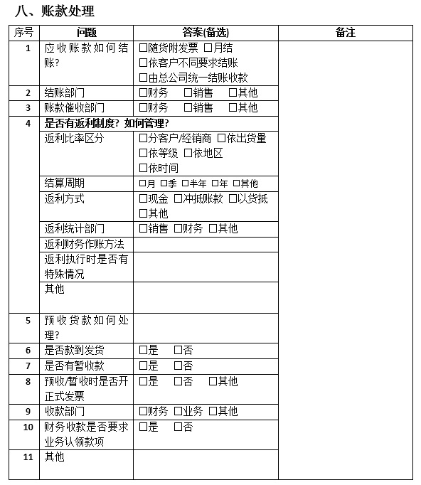 8 銷售部門是否有自己的應(yīng)收款賬本?如果有,是否跟財(cái)務(wù)賬保持一致?若有差異,造成差異的原因是什么?